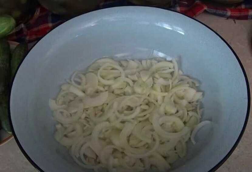 2. Огурцы промываем, отрезаем кончики с двух сторон и замачиваем на 2 – 4 часа в холодной воде. Затем нарезаем кружочками или полукружочками, отправляем к луку.