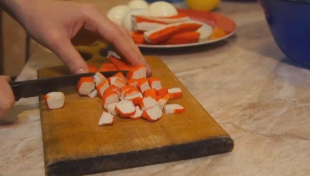 Размораживаем упаковку крабовых палочек и нарезаем их в виде кубиков.