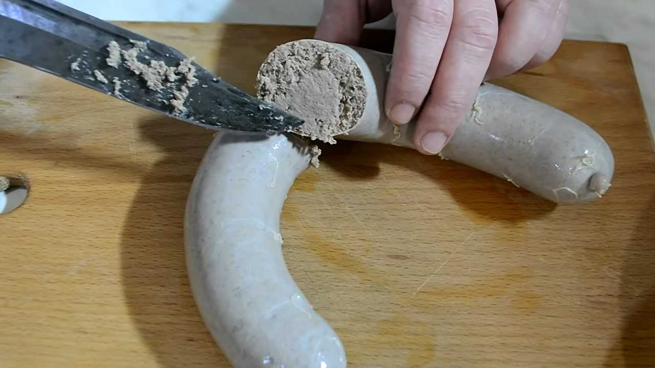 Заполнять сырье автор предлагает в натуральную свиную череву. И в завершение процесса изделие варится