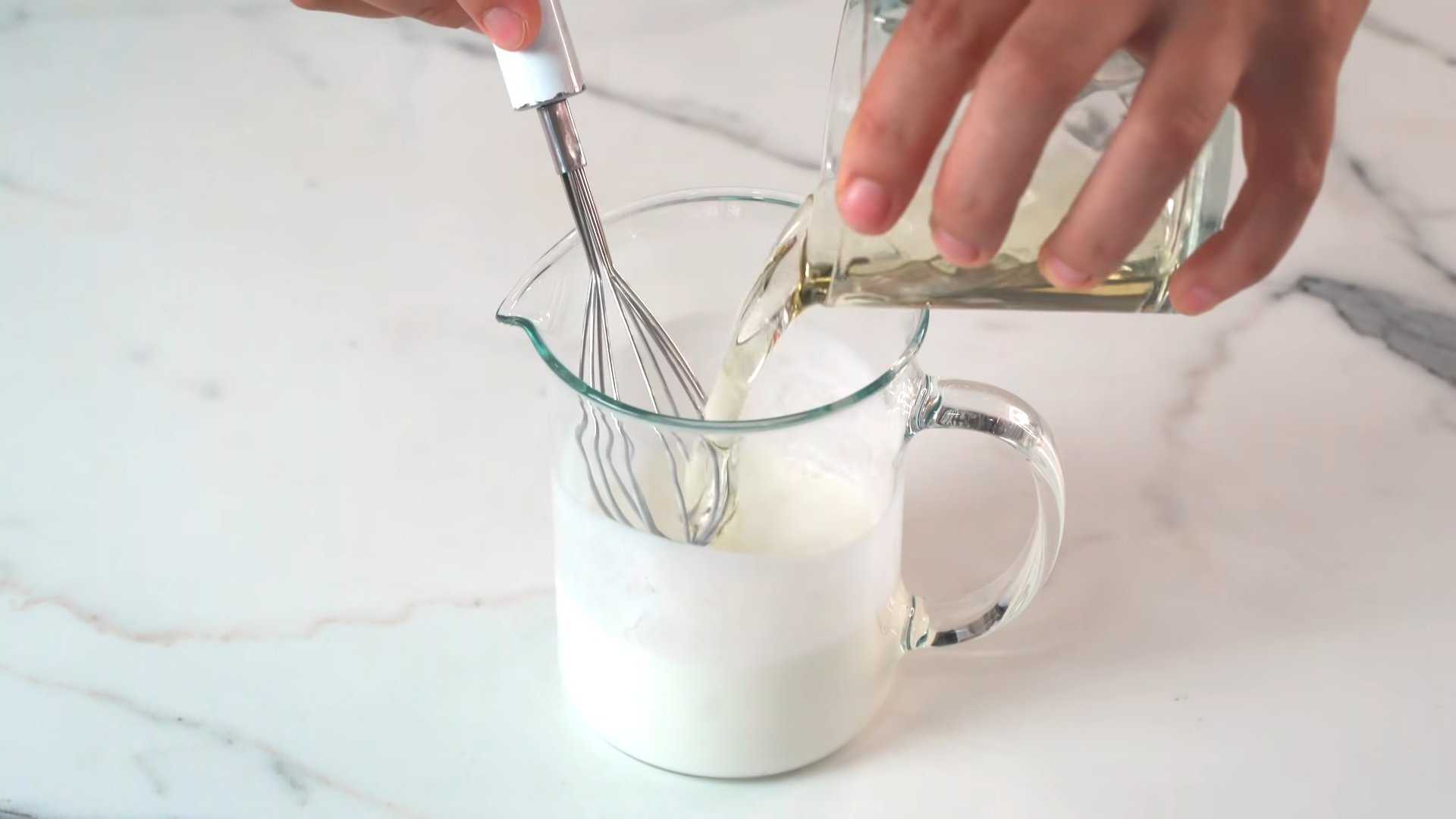 - Во взбитые (2 мин.) яйца вливают растительный жир, кефир. Продолжают соединять миксером все компоненты не менее 1 мин. Масса должна стать гладкой.