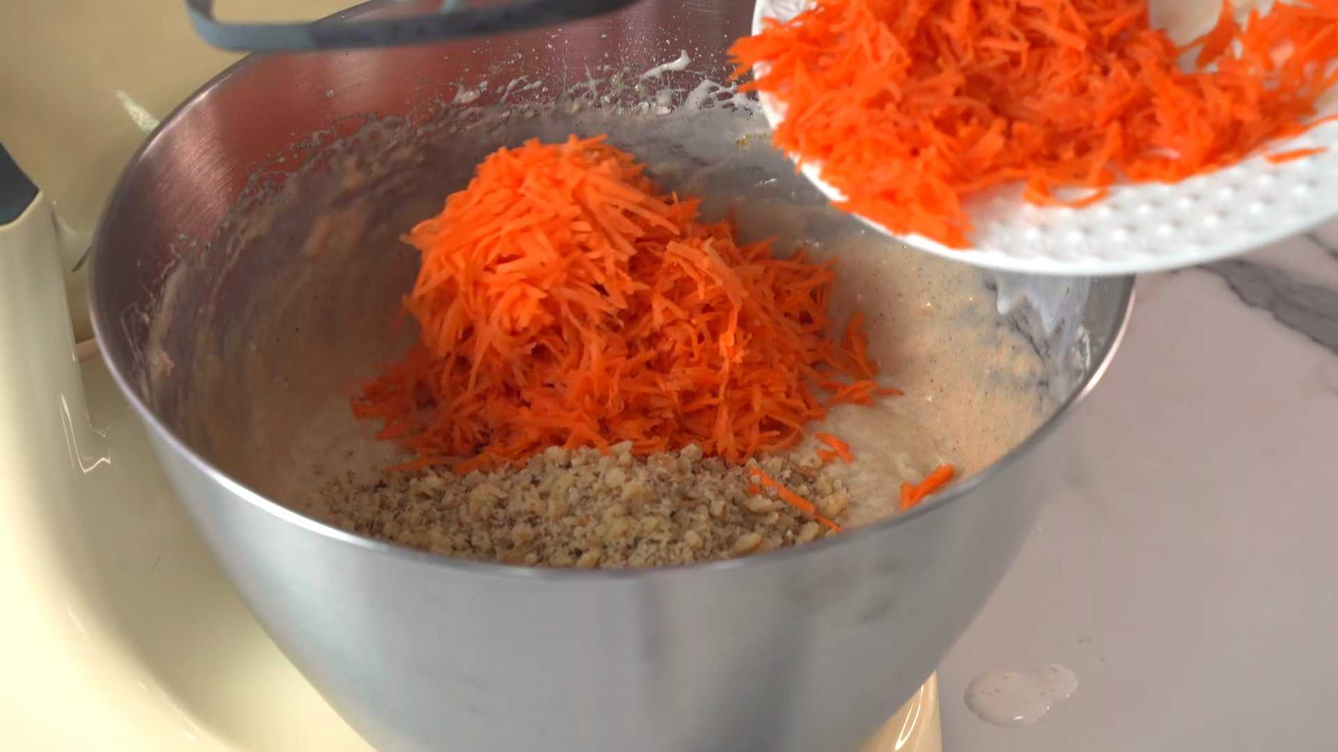 В получившуюся массу добавляем измельченные орехи и тертую морковь.