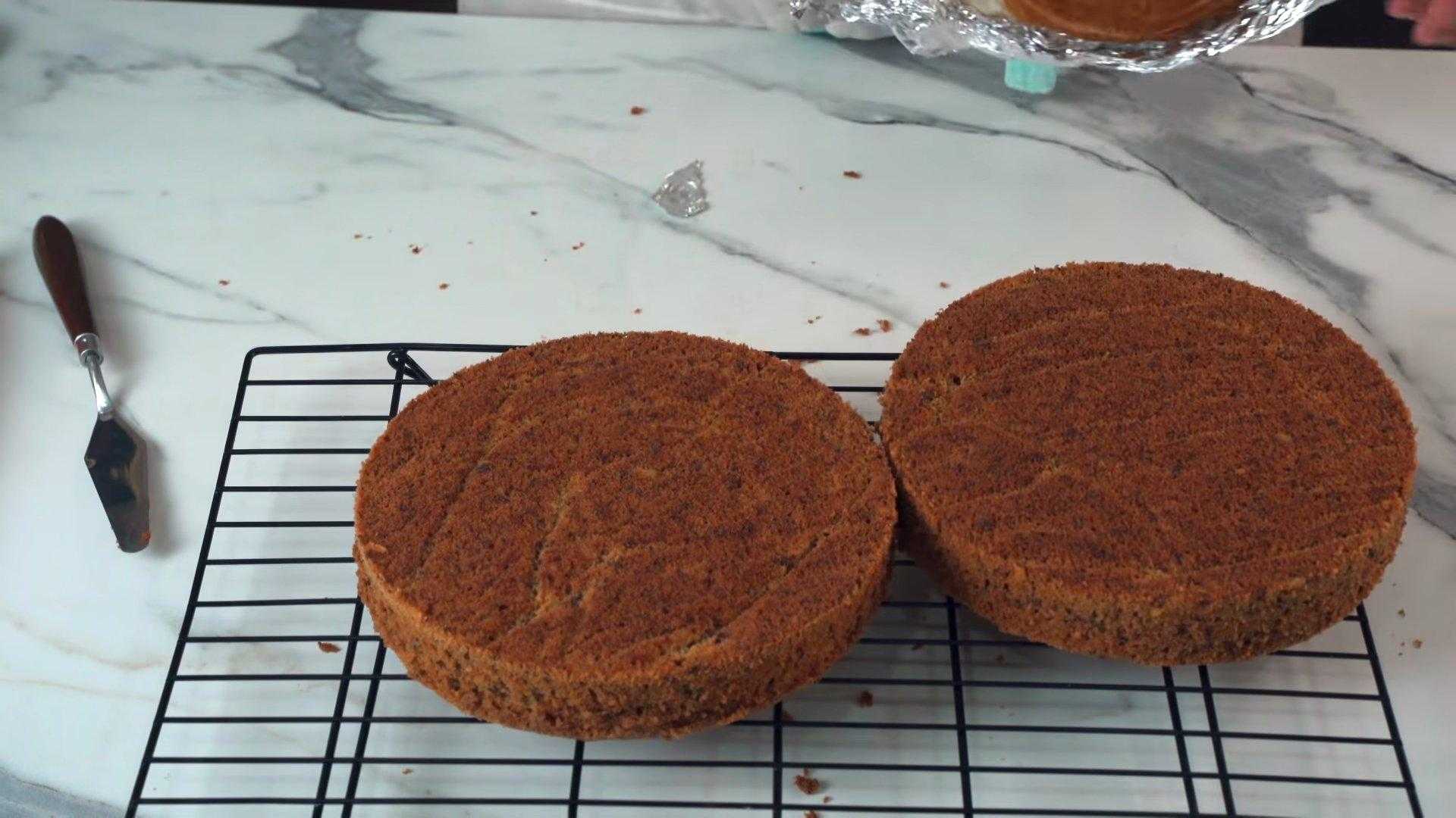 Дно формы застилаем пергаментом, выливаем тесто и печем бисквит 40 минут при температуре 200°С. Готовый бисквит достаем из формы, накрываем полотенцем и при возможности оставляем на 8 часов.