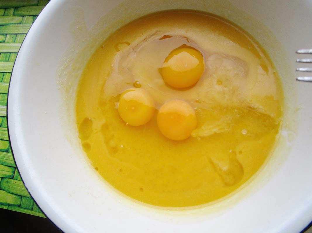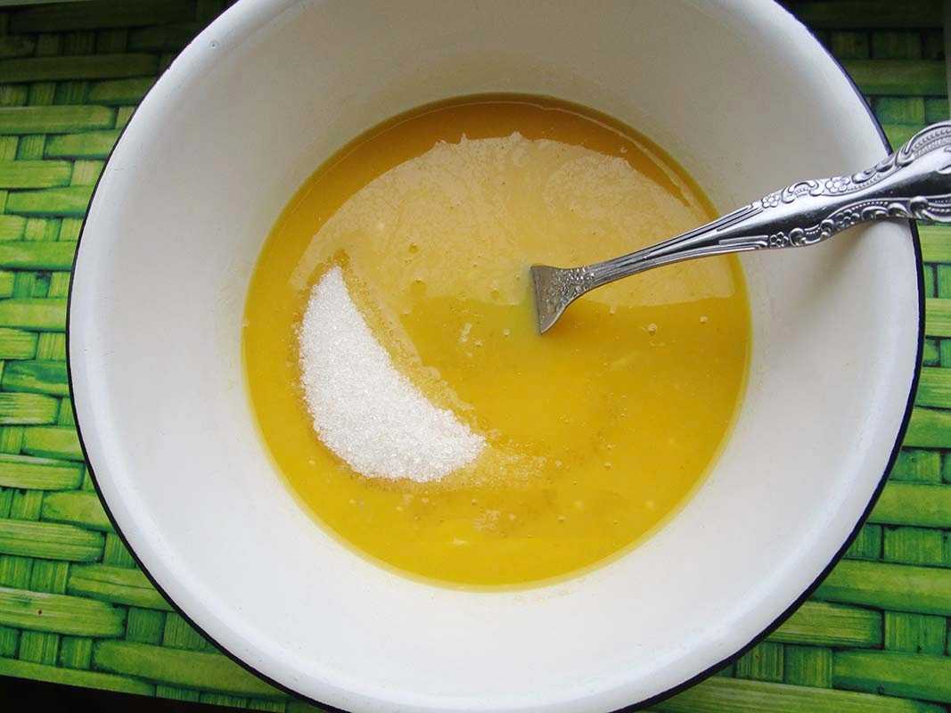 - Желтки взбить с заданным количеством сахара. Добавить всю муку сразу и вымешать полученный состав до однородности.