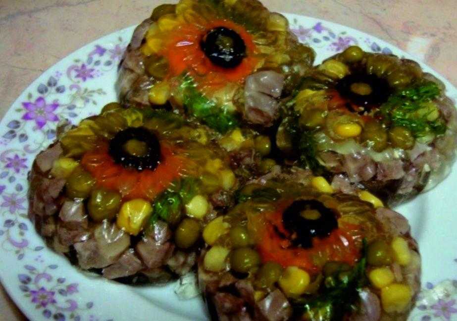 - Для украшения закуски на дно форм кладут ломтики моркови, кусочки соленого огурца, листья зелени, половинку яиц, клюкву, кукурузу, зеленый горошек. Заливают продукты бульоном, в результате чего они окажутся наверху и будут эффектно выглядеть.