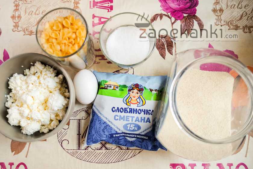 В макароны, вода и молоко, яйца, сахар, сухари, творог;