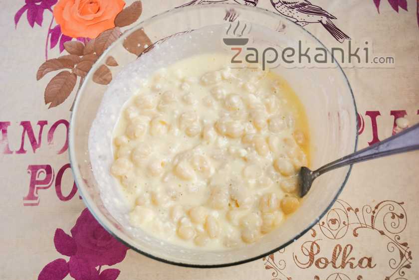 7. Далее в творожную массу выложить макароны и всё перемешать. Чтобы разнообразить вкус запеканки, можно добавить в неё сухофрукты, цукаты, цитрусовую цедру, орехи, шоколадные кусочки, кокосовую стружку. Можно каждый раз экспериментировать и получать новый вкус блюда.