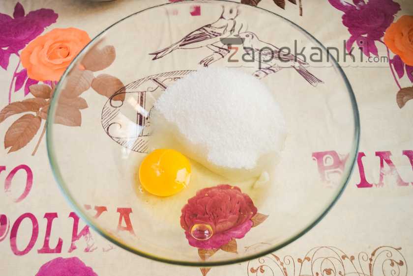 2. Пока макароны отвариваются, выложите в миску яйцо и сахар.