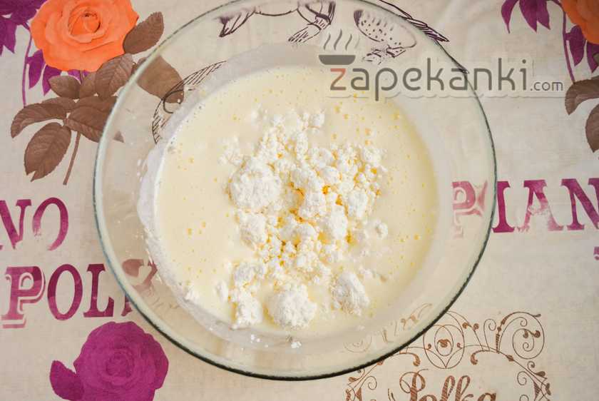 6. В яично-сметанную смесь добавить творог. Его можно заменить сливочным сыром, сырковой массой. В общем тем, что у вас есть и что вы любите больше всего. Творог можно перетереть через сито для нежной консистенции. Но если не перетирать, то запеканка получится с крупинками, что тоже очень вкусно. Здесь надо отталкиваться от вкусовых предпочтений. Для любителей творога – лучше крупинки, для тех, кто его не особо жалует – лучше перетереть и он просто придаст сливочный вкус макаронам.