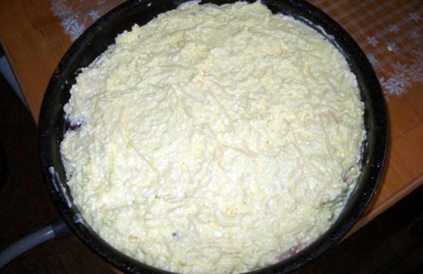 - Емкость для запекания смажьте сливочным маслом и отправьте в нее ранее приготовленную массу. Затем влейте сюда же взбитые с молоком яйца.