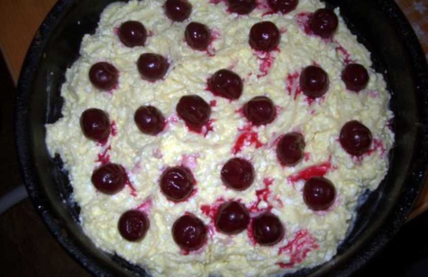 Всё, кроме макарон и вишен, смешайте в глубокой миске. У вас должно получиться что-то вроде творожного теста.