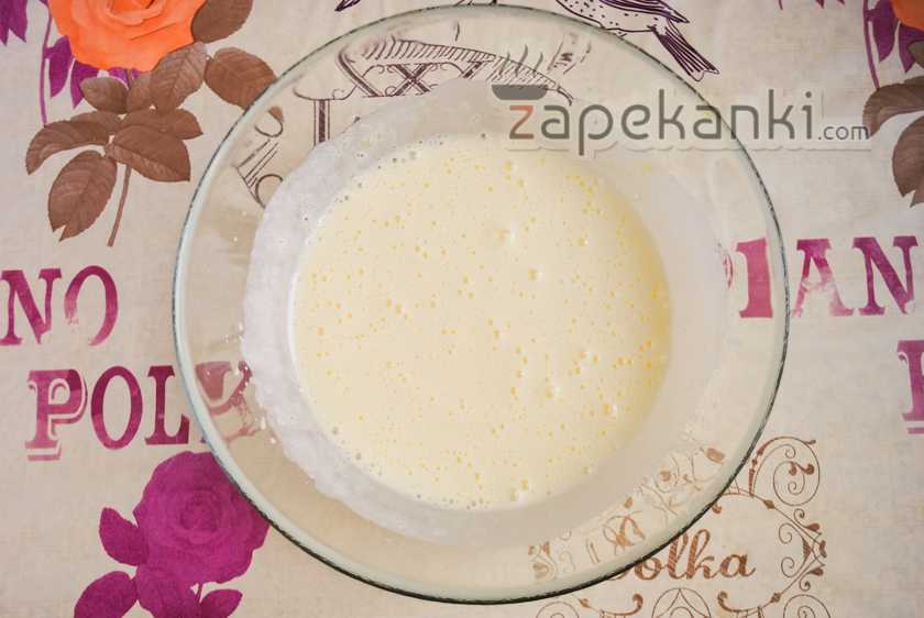 - Яйца вбиваем в глубокую тарелку и туда же вливаем молоко. Теперь эти ингредиенты нужно взбить миксером до появления небольшой пены.