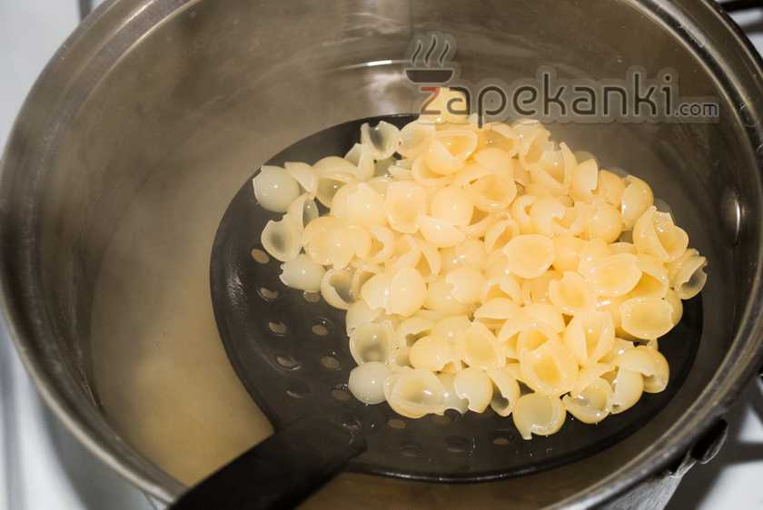 1. Макароны для запеканки можно использовать отваренные для гарнира. Если же готовых макарон у вас нет, то поставьте на плиту кастрюлю с водой. В закипевшую воду бросьте макароны и варите 5 минут. Они должны быть недоваренными, чтобы при запекании не превратились в кашу. Для запеканки можно выбрать любые макароны, спагетти или лапшу. Вкуснее всего и однороднее получится запеканка с небольшими рожками, ракушками.
