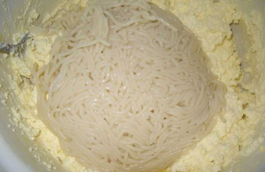 Сварите лапшу обычным способом, остудите и добавьте в получившуюся массу. Всё тщательно перемешайте.