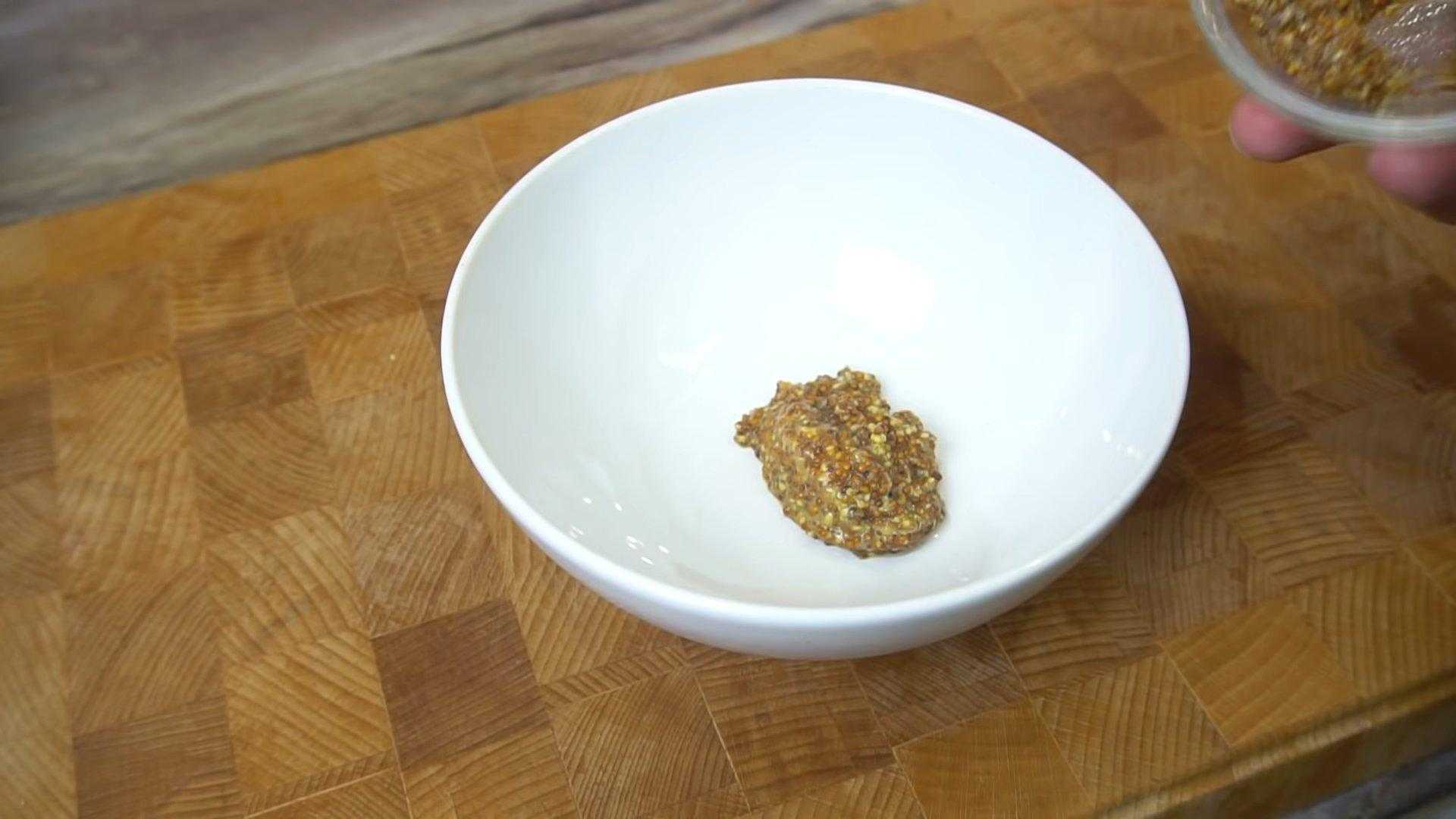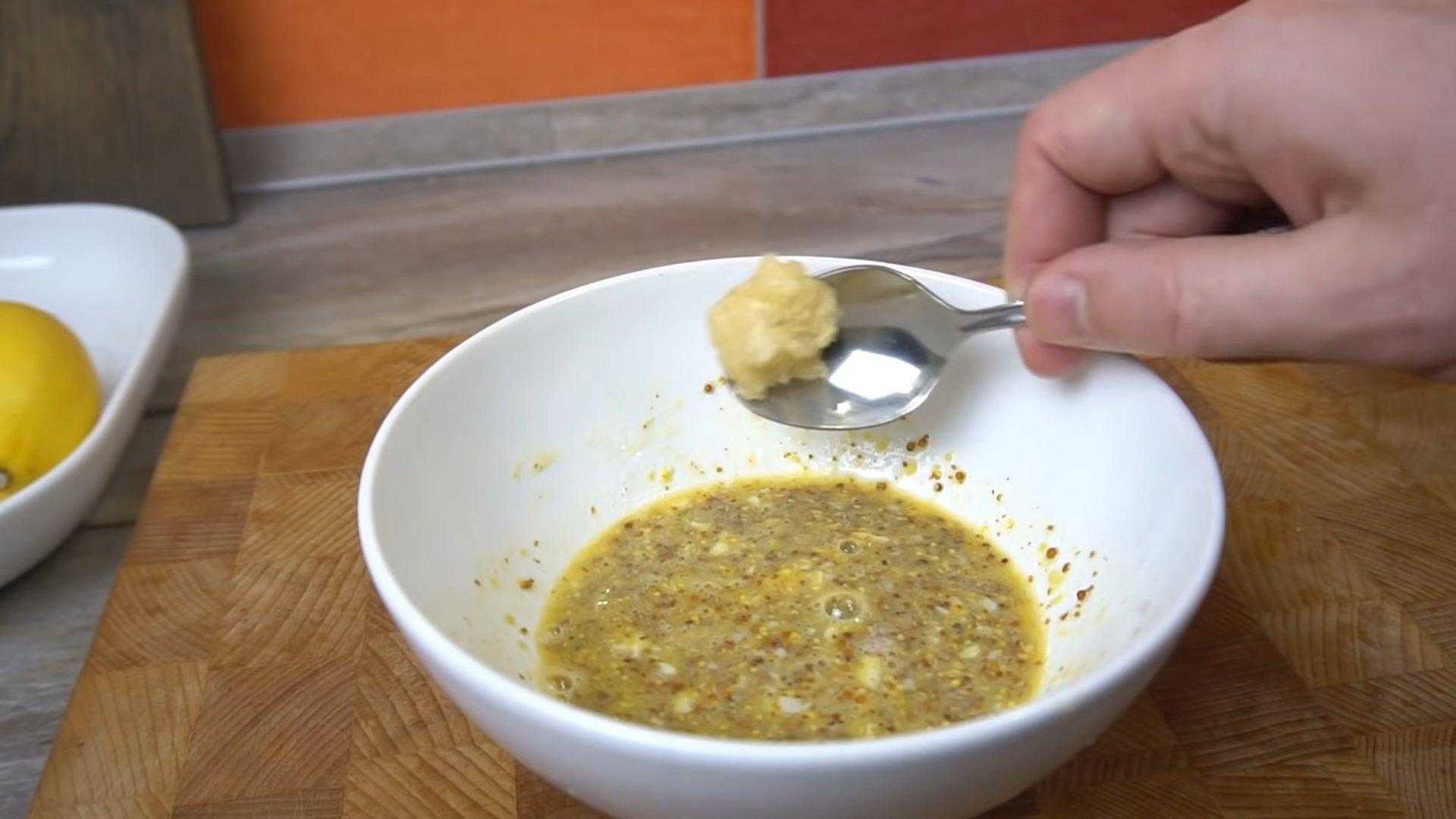 - Добавим к заправке горчицу зернами, соль и перец. Еще раз все перемешаем.