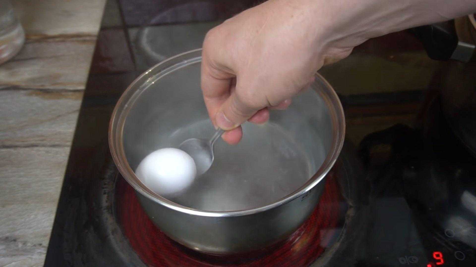 1. Промытое яйцо комнатной температуры надколоть с тупого конца тонкой иголочкой. Опустить его в кипящую воду буквально на 60 секунд и сразу же вытащить.