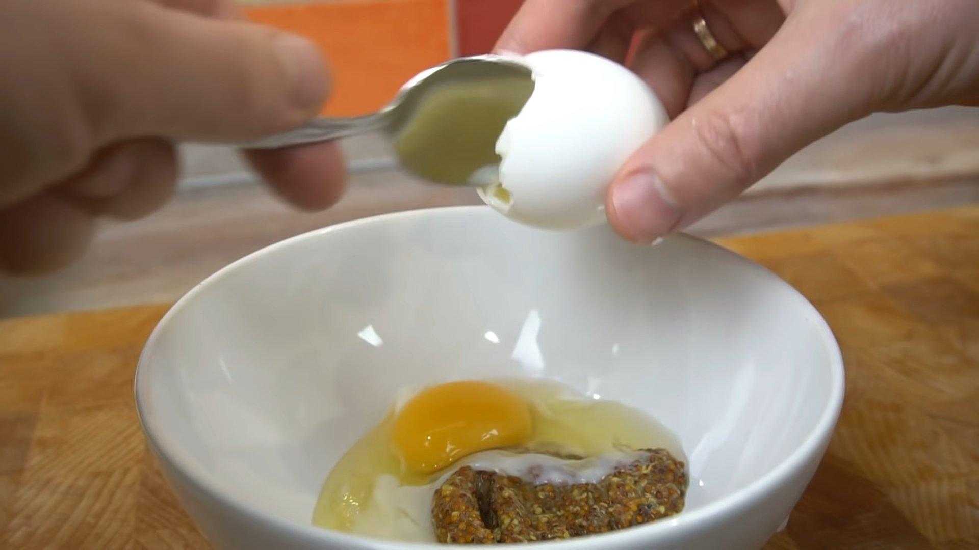 Его секрет в том, что яйцо должно быть не только что из холодильника, а поварившимся в кипятке одну минуту.
