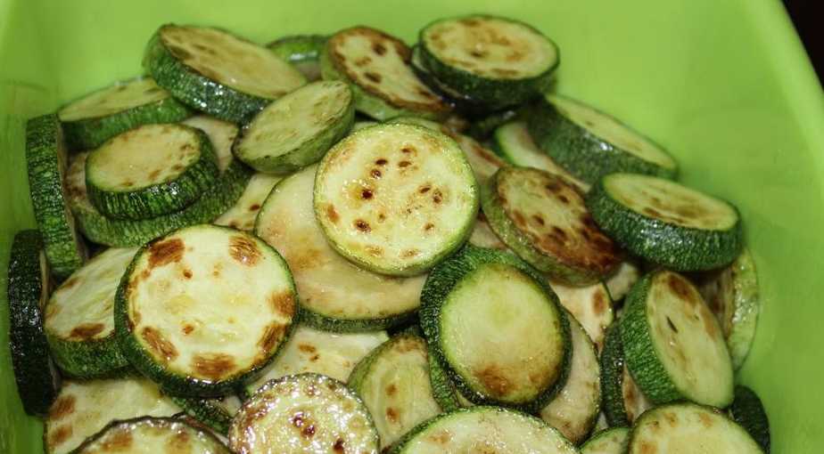 - Нарежьте кабачки сантиметровыми кружками. Обжарьте с двух сторон на растительном масле.