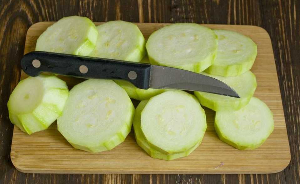 - Уберите кожуру с кабачков, срежьте кончики. Порежьте кружками сантиметровой толщины.