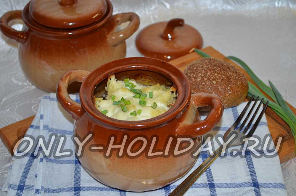 Установите керамические сосуды в духовой шкаф, температуру приготовления установите на отметке 180 градусов. Время запекания составляет примерно 40-45 минут, за 10 минут до окончания готовки насыпьте в каждый горшок тертого сыра.