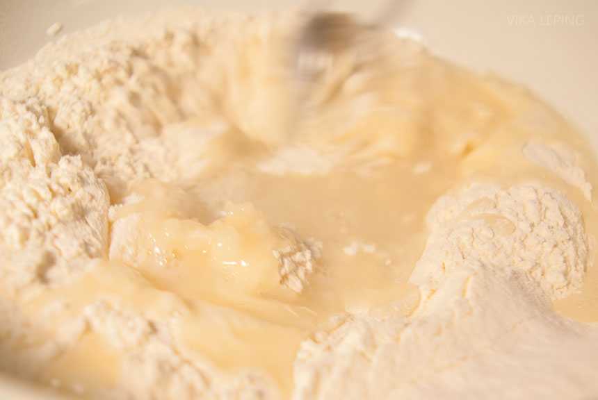 Просеять муку, сделать в ней воронку, влить подготовленную смесь и взбитый белок яйца.