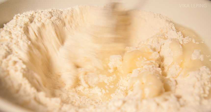 Берем вилку, делаем в середине муки углубление и выливаем в него стакан кипятка. Теперь самое главное — как замесить тесто на вареники и пельмени. Действуем быстро. Тщательно перемешиваем тесто с кипятком вилкой, не останавливаемся.
