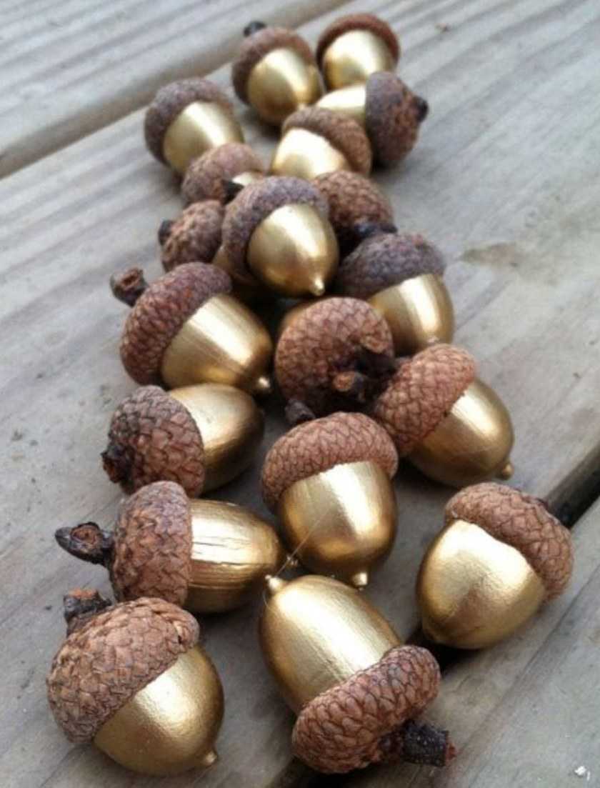 Желуди можно раскрасить золотой краской и уложить в декоративное ведерко. Само ведерко можно залить гипсом, а желуди зафиксировать в самом верху. У нас получится уютный элемент декора.