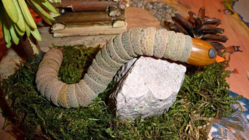 Гусеница из желудей, скрепленных пластилином, может быть выполнена ребенком уже двух-трех лет под присмотром взрослого. Поделки из желудей для маленьких детей очень популярны. Такими фигурками нельзя играть, т.к. они непрочные, но зато ими любуются.