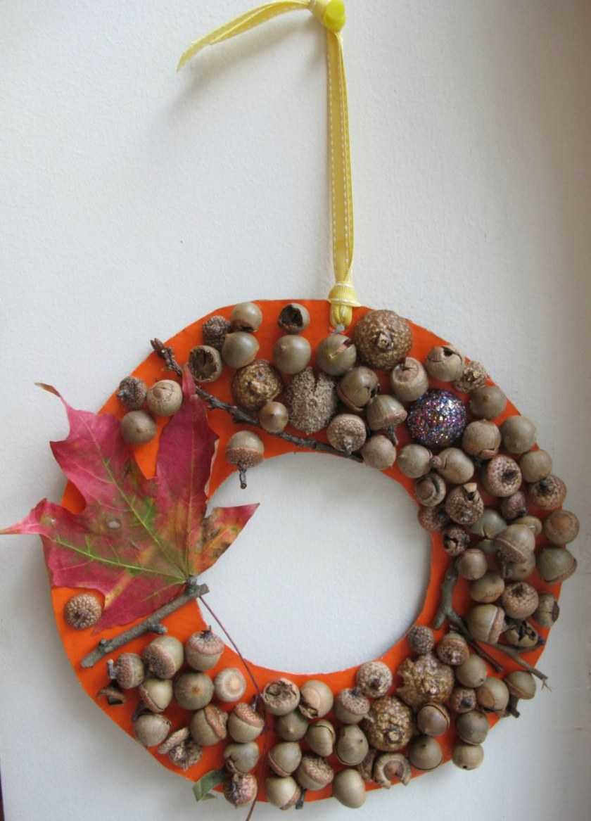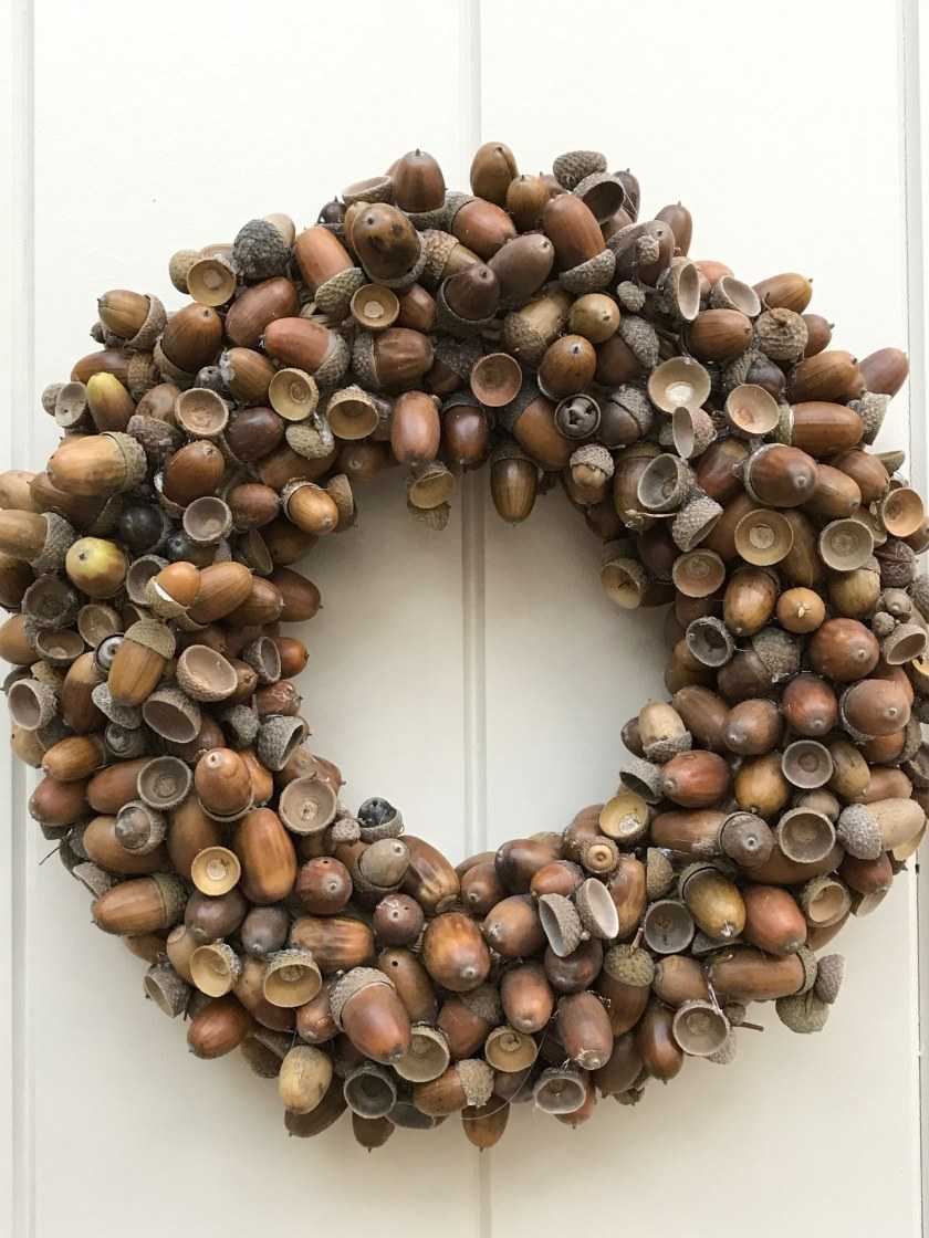 1. Начните приклеивать желуди к венку. Заполните весь венок.