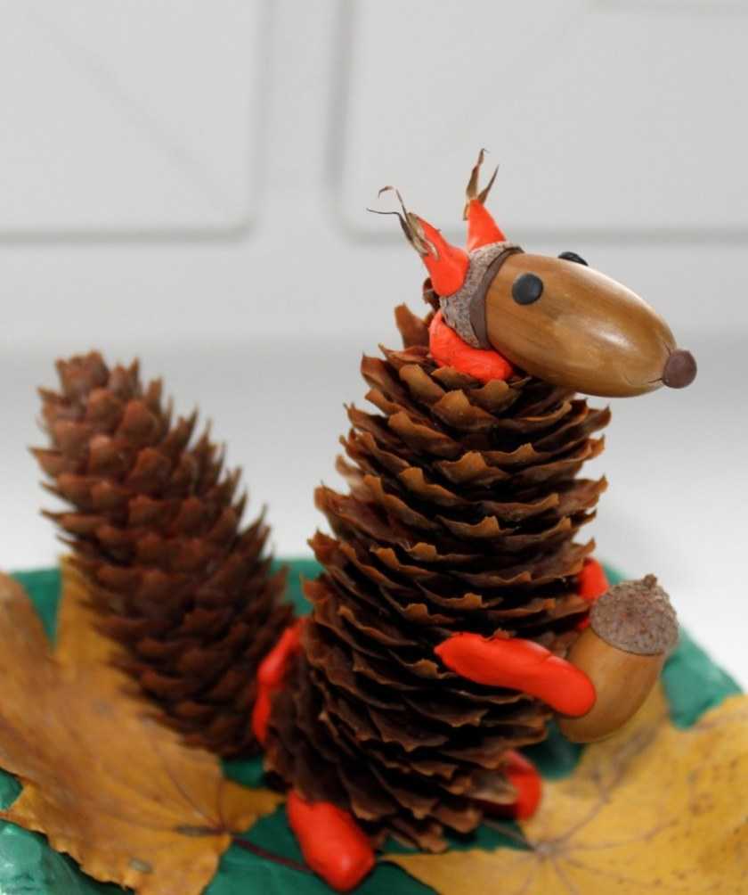 Расположите туловище горизонтально, поставив его на рыжие лапы. Головку из удлиненного желудя, с рыжими остроконечными ушами и вытянутыми, налепленными дугообразно глазами, соедините с туловищем кусочком белого пластилина. Хвост из еще одного желудя крепится к телу узким концом. Узнаете Лису Патрикеевну?