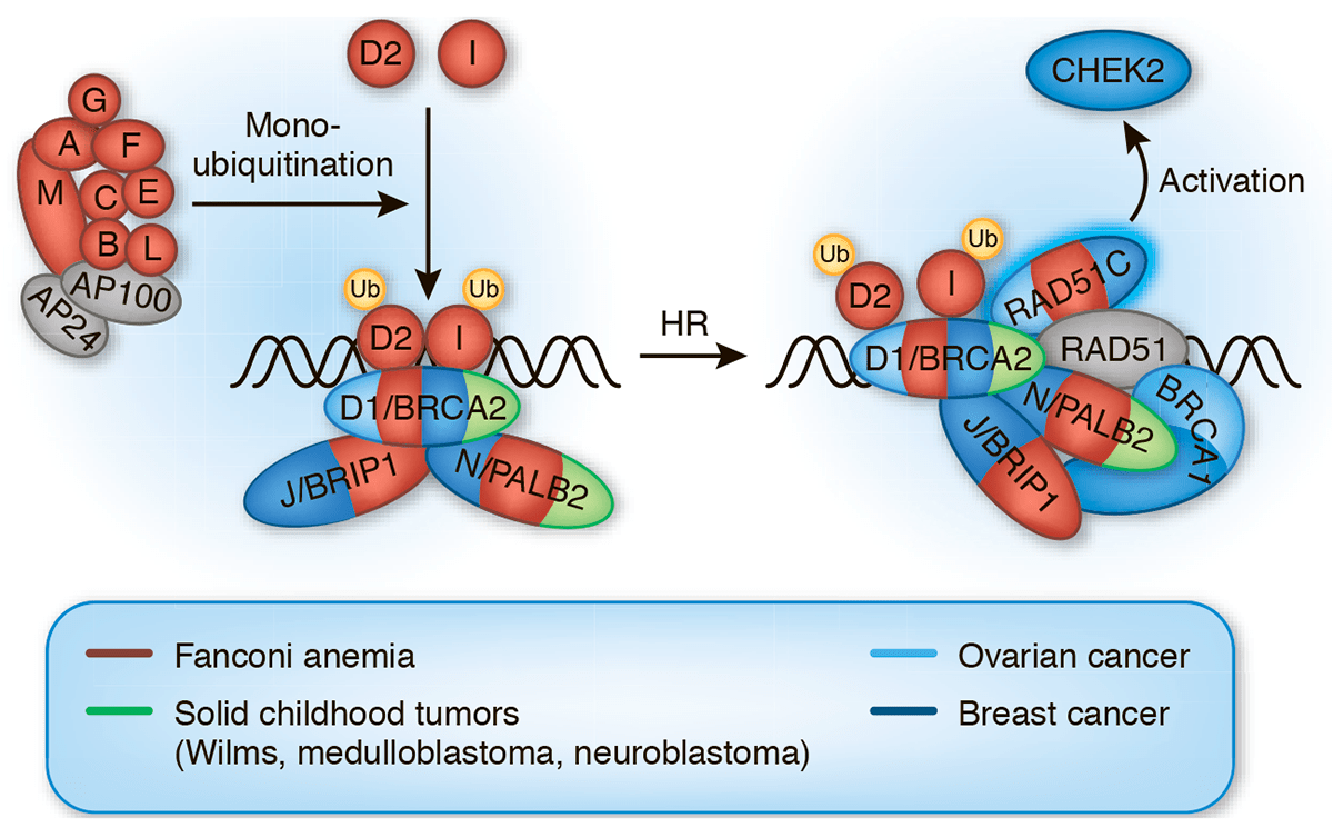Рисунок 3. Белковый комплекс репарации ДНК. На заключительном этапе — гомологической рекомбинации — требуются Rad51 и RAD51C и их взаимодействие с BRCA1 и BRCA2. RAD51C также активирует CHEK2. Окраска белков соотносится в мутациями в соответствующих генах, отвечающих за развитие заболевания: анемия Фанкони (красный), детские солидные опухоли (зеленый), РМЖ (темно-синий), рак яичников (светло-голубой). Ub — убиквитин.
