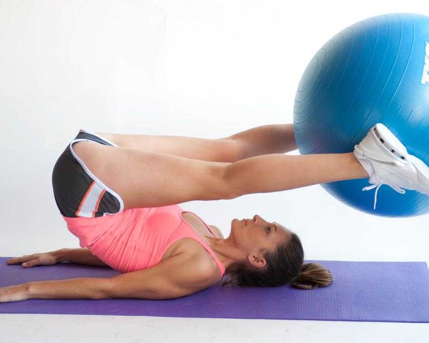 Данное упражнение на нижний пресс в тренажерном зале особенно популярно среди девушек. Зажав фитбол между ног, вы сильнее акцентируете нагрузку на нижнем отделе пресса. Поднимать ноги нужно примерно до прямого угла с полом, но ни в коем случае нельзя при этом округлять копчик. Следите за тем, чтобы спина была равномерно прижала к полу в момент подъема ног.