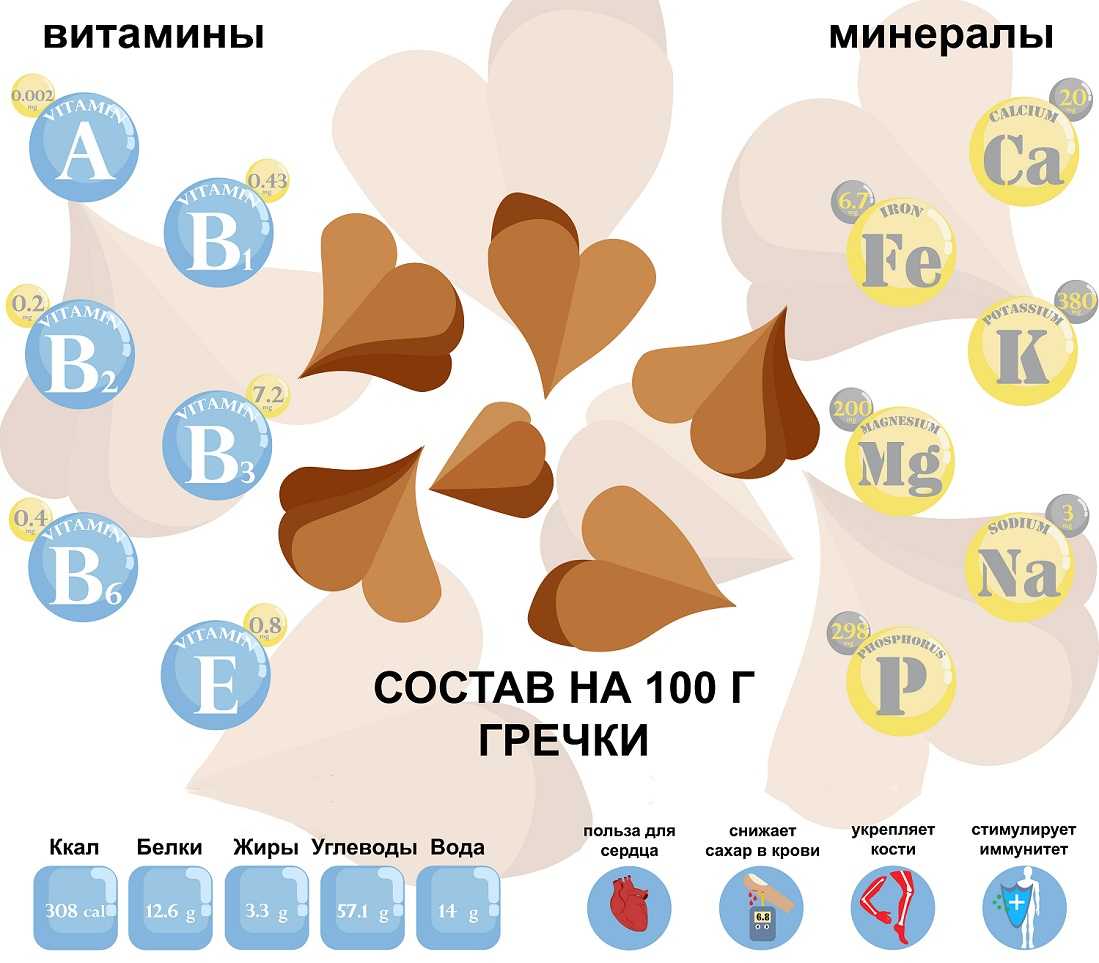 В состав гречневой крупы включены ряд микро- и макроэлементов, витамины группы В, Е, Н, К, РР, ниацин, А. Кроме того, продукт богат заменимыми, незаменимыми, моно- и полиненасыщенными кислотами. А растительные белки в его составе сходны по своим характеристикам с животными.