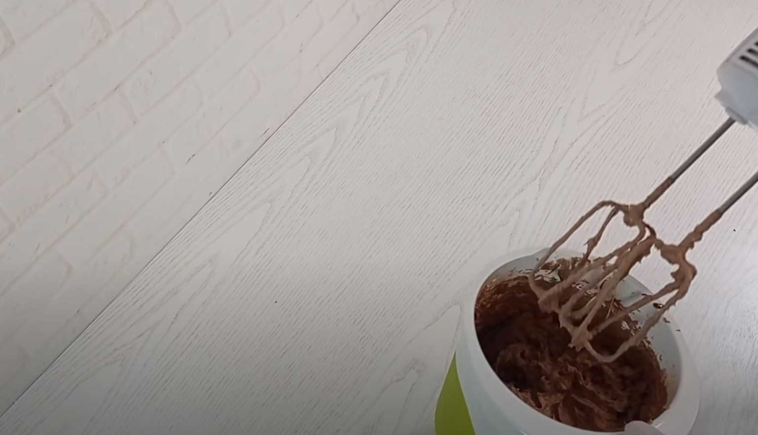 - Соединить все компоненты в глубокой миске. Миксером размешивать в течение 5 минут, начиная с медленных оборотов и постепенно повышая скорость.