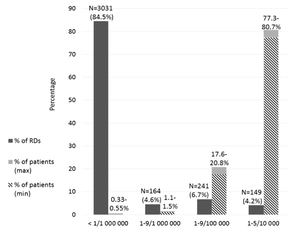 На графике представлены количество орфанных заболеваний и диапазон числа пациентов для каждого класса распространенности.