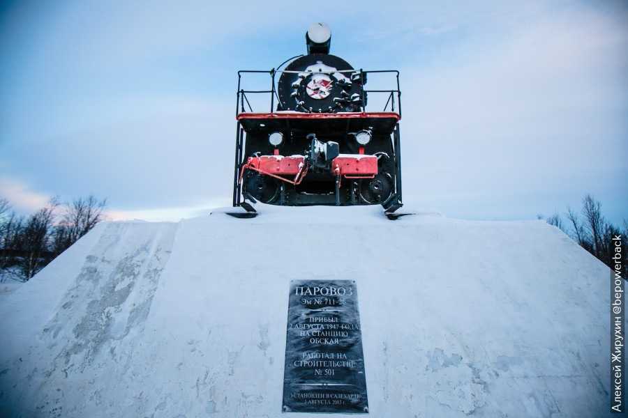 Он стоит в том месте, где и проходила железнодорожная колея. Также можно проследить следы железной дороги от памятника до взлетно-посадочной полосы аэропорта и даже дальше до берега Оби, где летом был паром, а зимой — ледовая железнодорожная переправа.