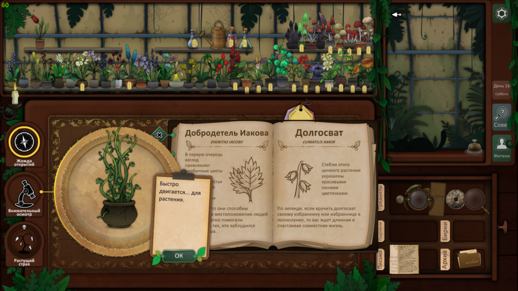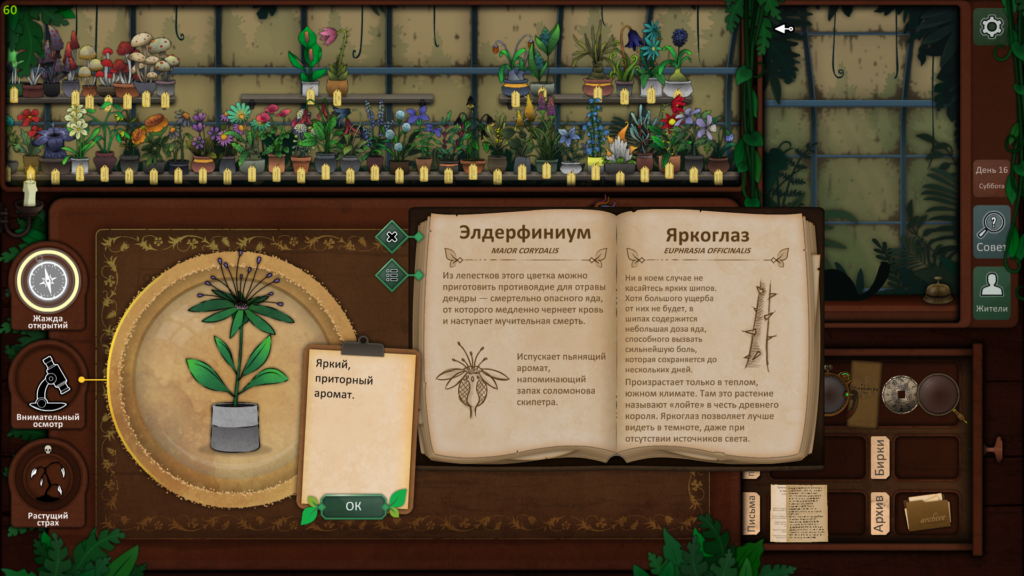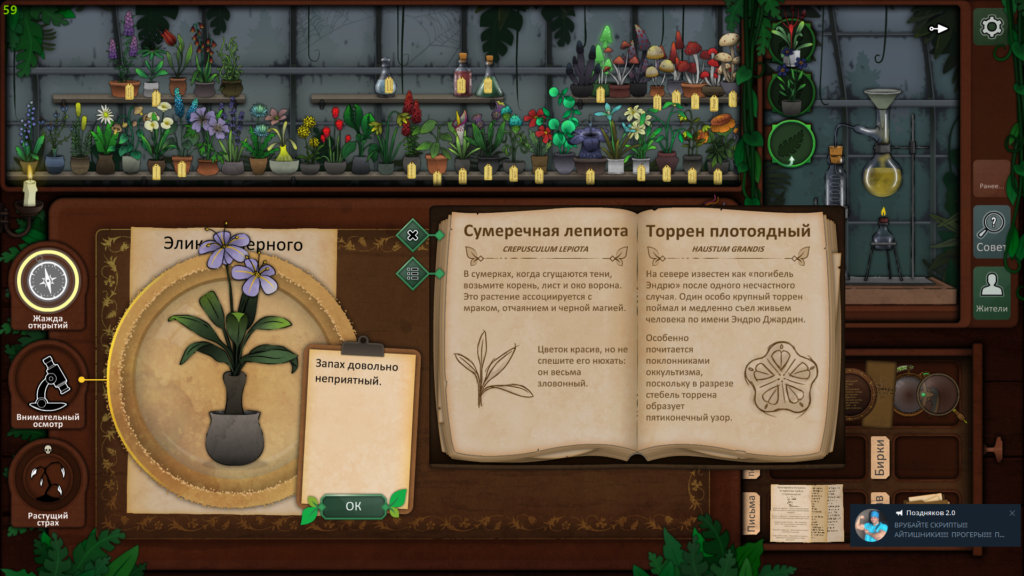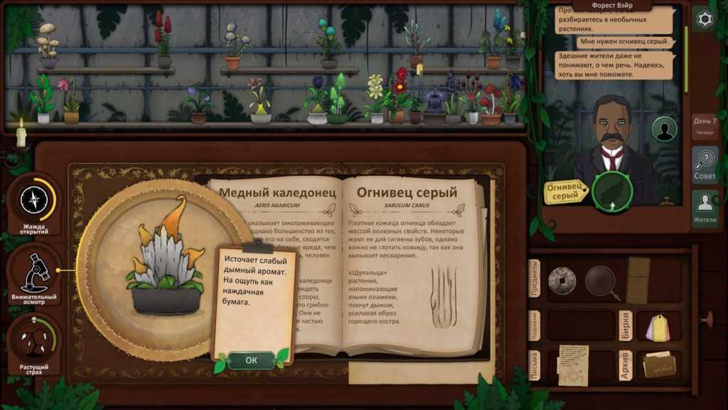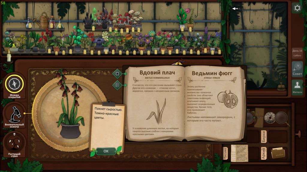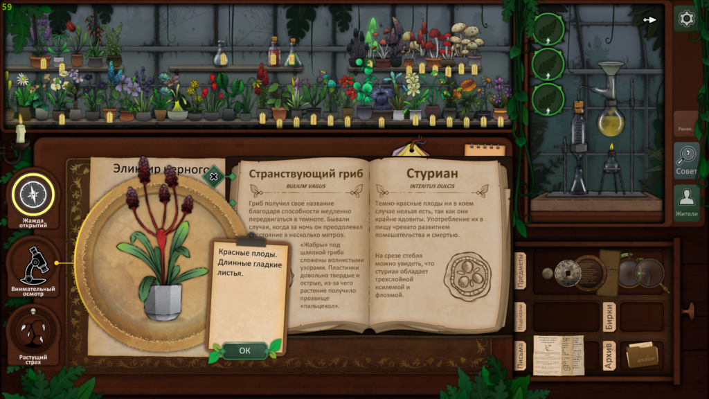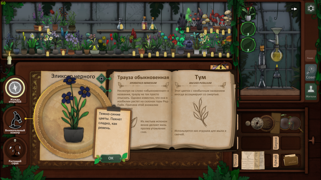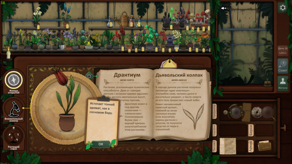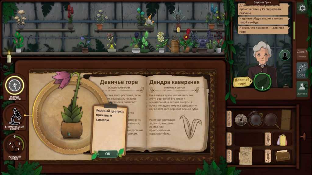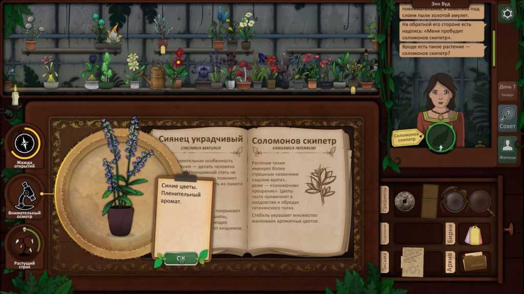 Пришло время использовать наши пять растений, чтобы провести ритуал и, надеюсь, связать существо. Используйте загадку со дна шкатулки, чтобы выяснить, какие растения вам нужны. Друг мертвеца — дьявольский колпак, жвала капкана ловца — долгосват, страха будитель — вдовий плач, скромница длинная снимет порчу, а из крови мрак изгоняет — эльдерфиниум.