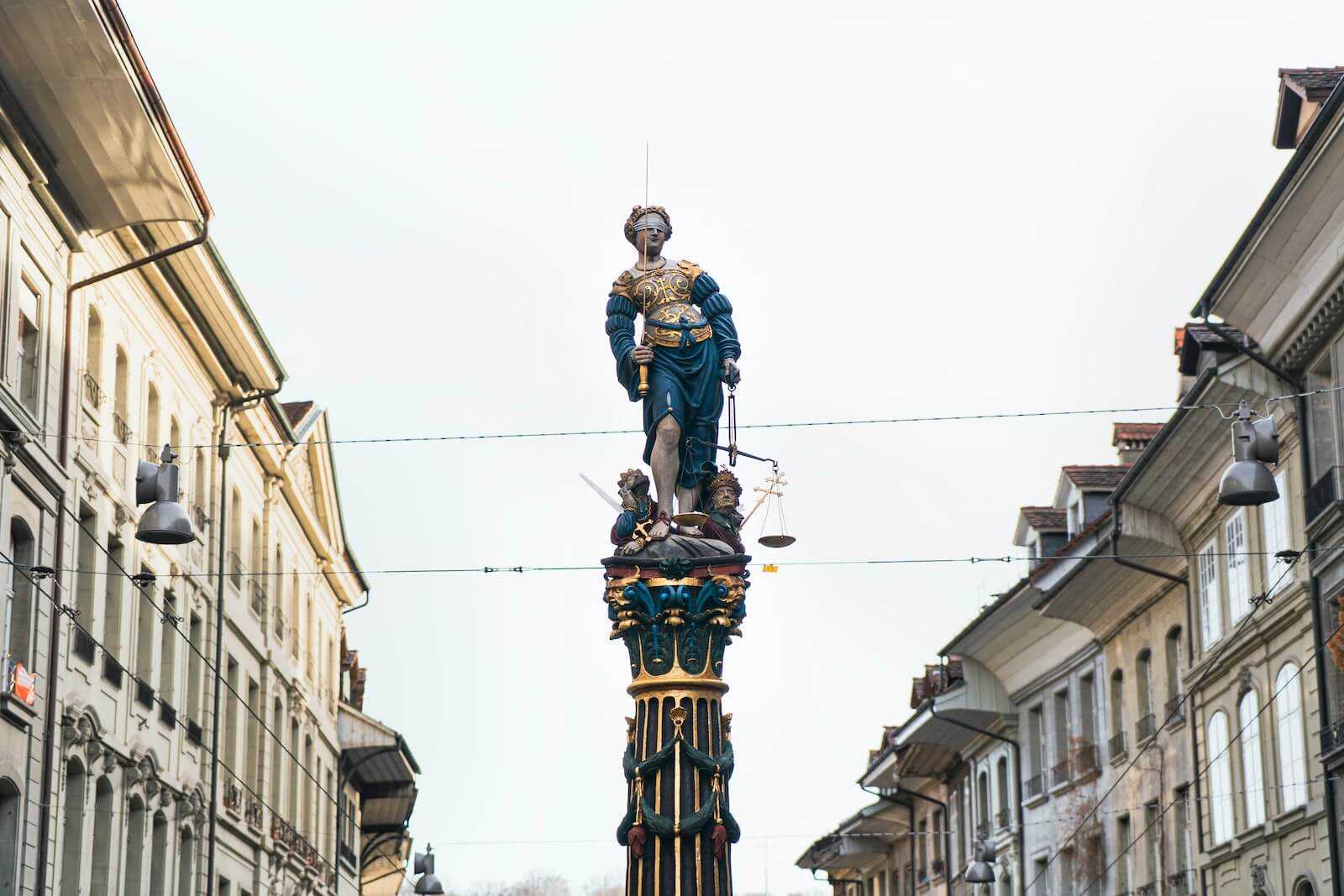 Фонтан построен в XVI веке. От подобных памятников старины «Юстиция» отличается тем, что выглядит сегодня как в день своего открытия. Точнее: после замены деревянных элементов на каменные. «Юстицию» никогда не переносили на другое место и не перестраивали в угоду новым политическим реалиям. Фонтан разрушали вандалы, после чего сооружение бернцы кропотливо восстанавливали по частям.