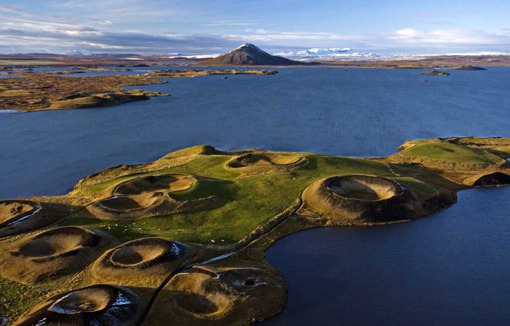 Озеро Миватн. Это визитная карточка Хусавика. Озеро расположено в центре вулканической области Наумафьятль. Это необычное место может рассказать, как выглядела наша планета на заре своего существования. Затвердевшая лава, что создаёт необычный ландшафт, бурлящие кратеры, – всё это можно увидеть на озере Миватн. Учёные находили здесь древние захоронения викингов.