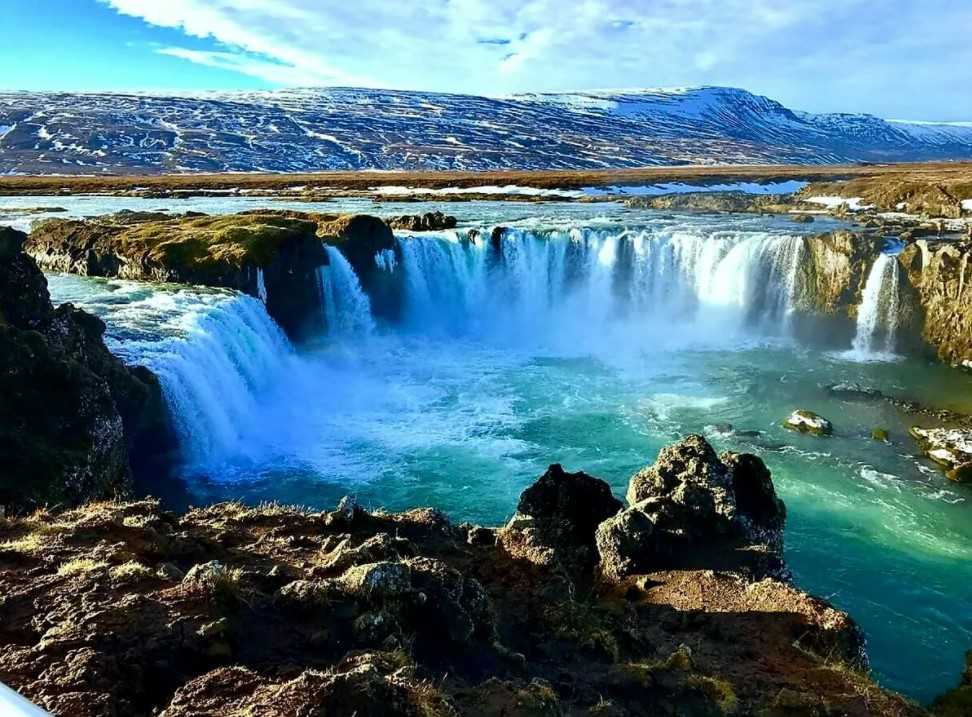 Водопад Годафосс. Также известен, как «Водопад богов». Когда-то языческий жрец поместил фигурки богов на вершину этого водопада, отсюда и пошло название. Годафосс расположен рядом с Хусавиком, на реке Скьяульвандафльоут, и признан в Исландии самым красивым и самым мощным водопадом.