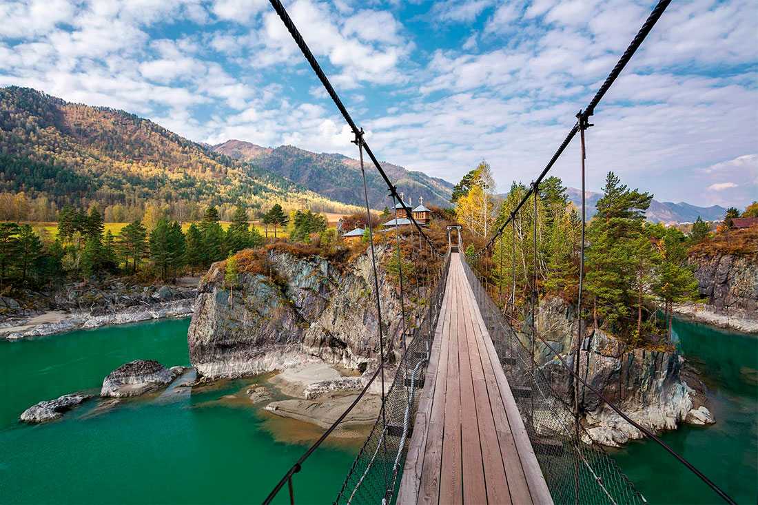 С «большой землей» остров связан подвесным деревянным мостом, переброшенным через бурную Катунь. Ступить на довольно сильно раскачивающуюся конструкцию немного страшно, но, тем не менее, каждый день на Патмос приходят сотни туристов, влекомых невероятными пейзажами, которые можно увидеть во время прогулки по этой дороге.