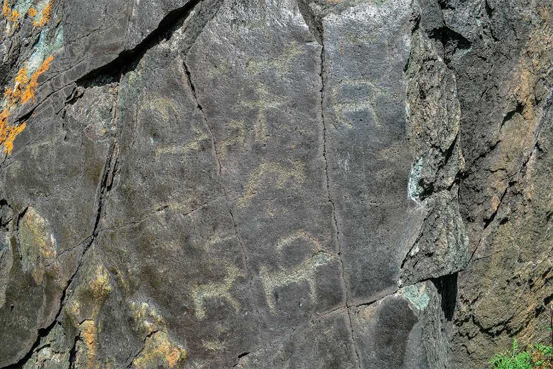 Изображения оленей, лосей, быков, козлов, каких-то фантастических животных видны здесь практически повсюду. Специалисты насчитали в этом районе около 200 различных петроглифов, основная масса которых датируется эпохой бронзы.