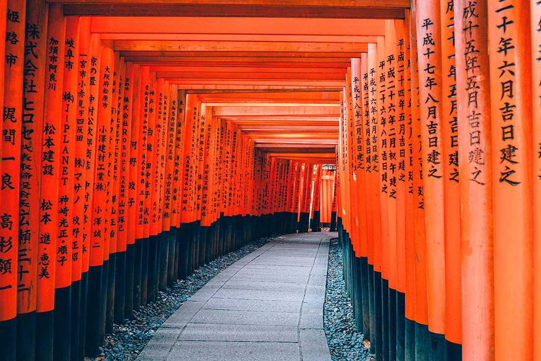 Во время празднования японского Нового года миллионы людей приходят сюда, чтобы отдать дань уважения Инари. Впрочем, и приезжающие со всего мира туристы считают этот храм тем местом, что посмотреть в Киото нужно всенепременно. Вдоль дорожки, ведущей к храму, расположенному на горе, на высоте 230 метров, установлены сотни ярко-красных торий (ворот).