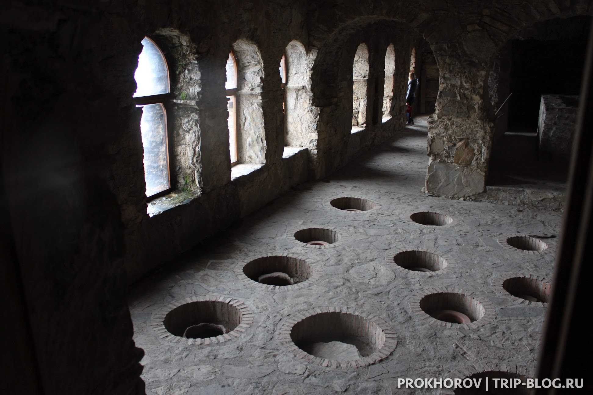 - Винный завод Хареба. Место, само по себе, достойное отдельного внимания. Владельцы выкупили длиннющий (несколько километров) туннель, который в советское время использовался как государственное винохранилище. Сейчас здесь проводят исследования, цель которых вернуть утраченные сорта винограда. Туристов водят по туннелю, устраивают как обычные, так и театрализованные дегустации под грузинский хор с открыванием квеври. Правда, последнее исключительно для очень уважаемых людей. После ритуальных возлияний гости прямо из туннеля возносятся на лифте в ресторан, лучшая часть которого — терраса с видом на уже знакомую Алазанскую долину. Дышать и наслаждаться.