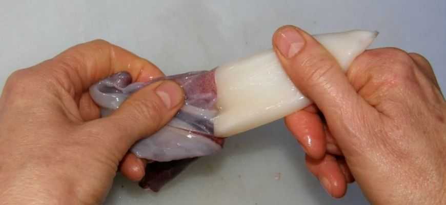 Также стоит обязательно избавиться от внутренностей кальмара, нащупав их рукой и потянув на себя, или просто вывернув тушку наизнанку. После такой очистки продукт готов к приготовлению.