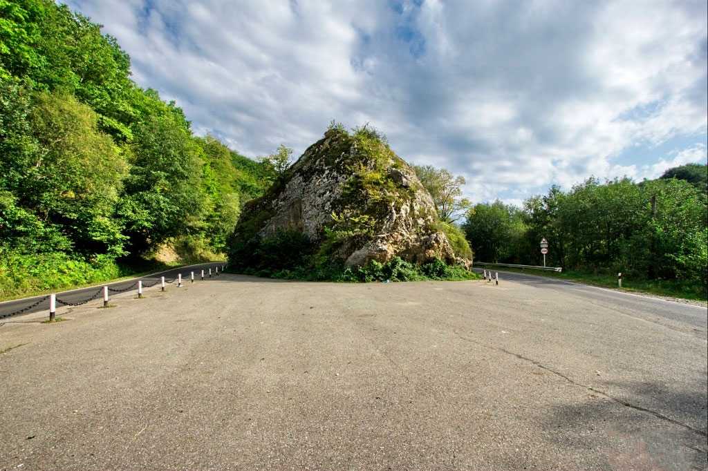 Огромная каменная глыба расположена посреди дороги, недалеко от поселка Каменномостский. Вероятно, много лет назад она отделилась от хребта Уна-Коз и скатилась в долину. Сейчас это достопримечательность, овеянная легендами.