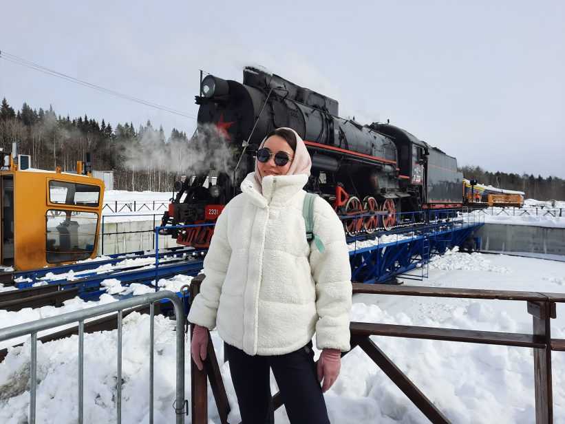 В самой Рускеале на выходе из поезда нас ждало еще одно впечатляющее зрелище. В течение 15 минут паровоз, который привез нас в парк, на специальной поворотной платформе разворачивается с помощью разворотного круга. Такого я еще не видела нигде!