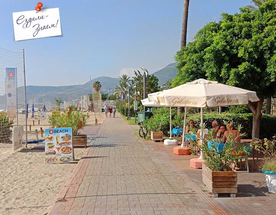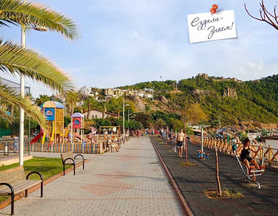 Вдоль пляжа тянется ухоженная набережная с небольшими парками, детскими площадками, кафе и ресторанами. Это первая достопримечательность Алании, которую невозможно пропустить.