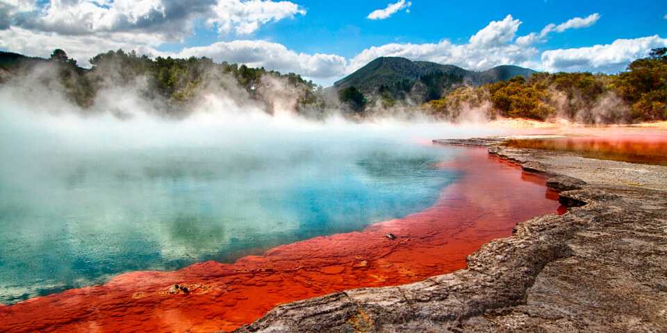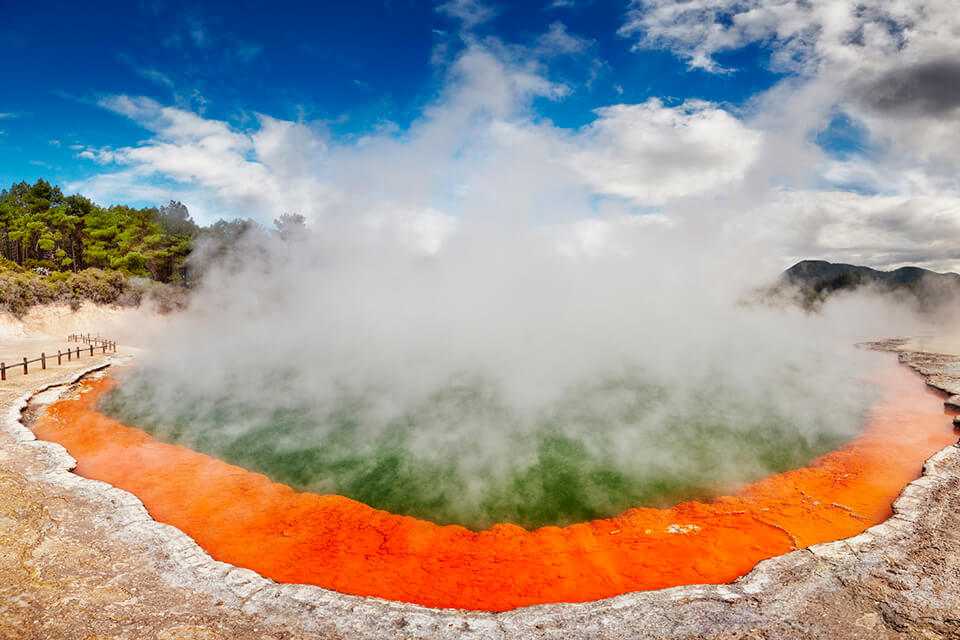 Еще одно новозеландской чудо, достойное внимания — термальный комплекс Уаи-о-Тапу, царство гейзеров, минеральных источников и воды. Площадь комплекса не слишком большая, всего 3 квадратных километра, однако объектов заслуживающих внимания здесь хватает. Для удобства туристов по территории проложено три маршрута. Наибольшей популярностью у гостей пользуется Бассейн с шампанским. Конечно, он заполнен не этим напитком, но из-за бурлящих пузырьков углекислого газа визуальное сходство есть. Кстати, температура воды на поверхности доходит до + 76 градусов, а в глубине и вовсе до +260!