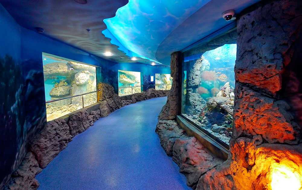 Понаблюдать за жизнью разнообразных рыб, морских звезд, скатов, лобстеров, морских коньков, акул, мурен, пираний и других обитателей можно под сопровождение негромкой музыки. Здесь есть фонтан и бассейн с декоративными японскими карпами. Для тех посетителей, кто захочет узнать подробную информацию, размещены экраны и предоставляет услуги экскурсовод. Яркие краски подводного мира никого не оставляют равнодушными, а аудио-сопровождение делает посещение океанариума увлекательным.