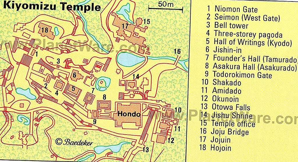 Какие здания мы встречаем в Киемидзу-дэра? Храм со статуей одиннадцатиликой богини Каннон, трёхъярусную пагоду (самая высокая из подобных) Сандзю-но-то, выкрашенную в ярко-красный цвет киноварью, колокольню Сёро 1596 года, молельное помещение, хранилище священных свитков и книг — зал сутр Кёдо с драконом на потолке, конюшню постройки 14-16 веков, ворота Нио-мон с каменными стражами … В Зале основателей храма можно «познакомиться» с отшельником Гёэем, монахом Энтином, полководцем Тамурамаро и его женой Такако.
